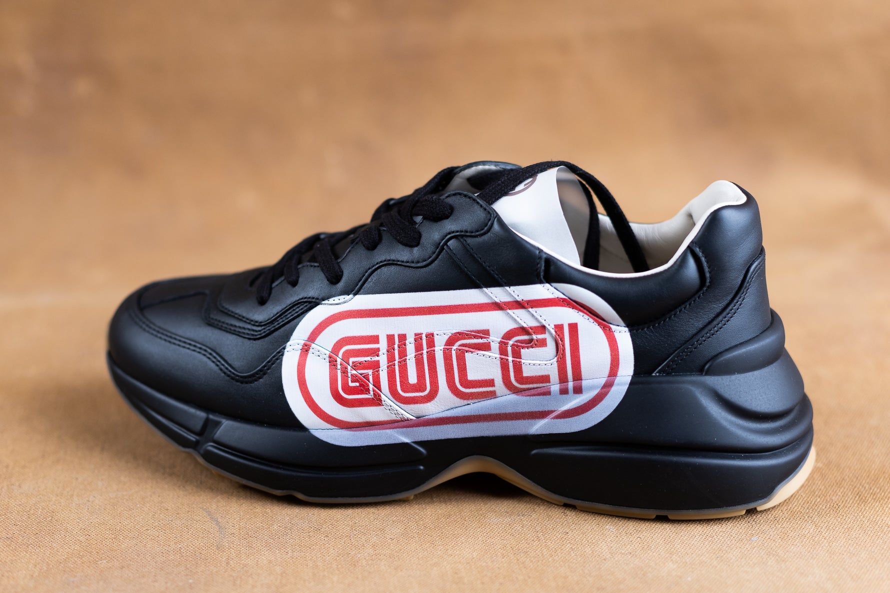 Unit price perThis is an authentic pair of GUCCI Calfskin Gucci logo Printed Mens Rhyton Sneakers size 9 in Black. These stylish chunky sneakers are made out of black leather with a red, white, stripe Logo print at the sides.
