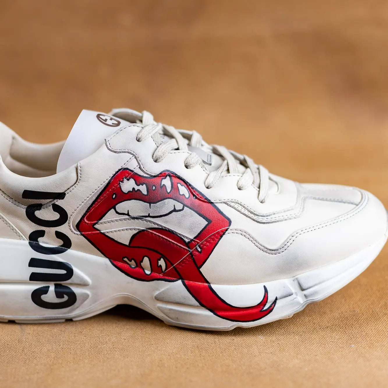 Unit price perGucci releases another take on its Rhyton sneaker. Rather than go for a solid-colored upper this time around, Gucci has elected to leave the off-white leather uppers alone, but instead, opted for a distressed and worn application on the surface of the leather.