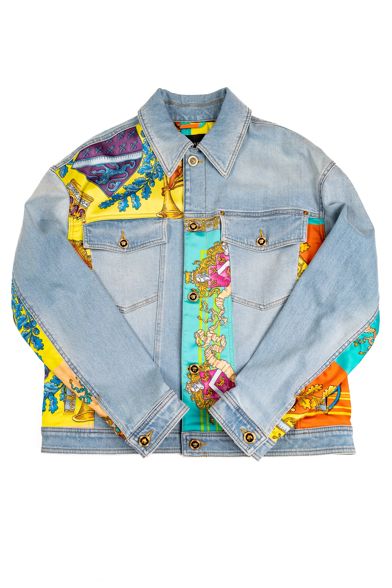 Light blue denim jacket from Versace. Fastened with decorative buttons with the iconic Medusa head, this garment features multicolored inserts with the ‘Royal Rebellion’ pattern, logo-embossed leather patch in brown, two buttoned flap pockets, two slip pockets and long sleeves with buttoned cuffs.
