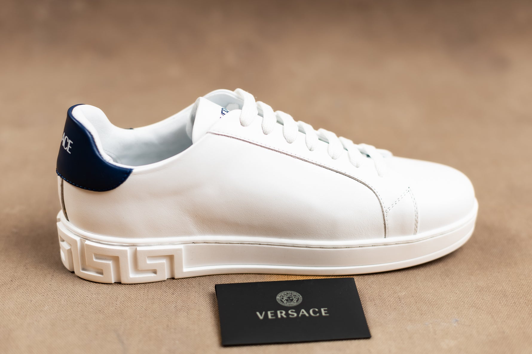 Pantofi albi din piele naturala, sport, cu profil jos si inchidere cu sireturi, captuseala din piele, bot rotund si talpa dreapta din cauciuc cu model Greca in relief. Detalii: Inatime talpa- 2 cm. 100% piele naturala; 100% piele naturala; 100% cauciuc. Vin insotiti de cutia originala saculet si cardurile aferente brandului Versace